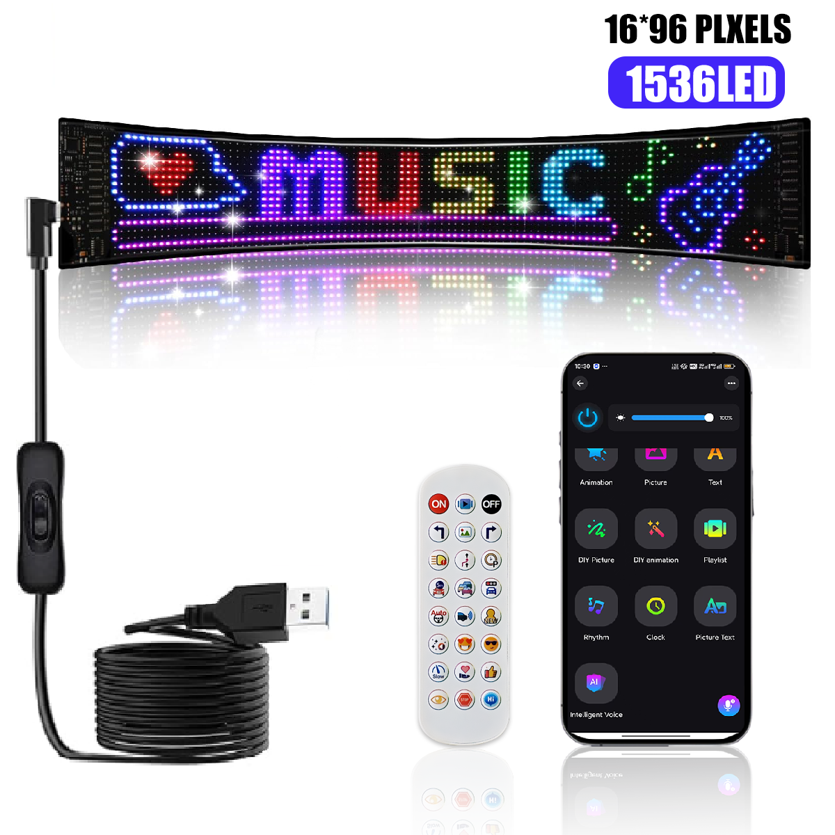 【Flexible & Safe to Use】Crafted from flexible PU and FPCB materials, the LED scrolling sign features an ultra-thin and lightweight design, which can be easily rolled up for storage and portability. It comes with a USB port and a 14.8ft USB cable, supporting multiple power supply methods: it can be powered by a 5V/2A phone charger, power bank, or the 5V/2A USB interface of a vehicle. With low 10W power consumption, it saves energy efficiently, and its low heat emission ensures safe touch during use.
